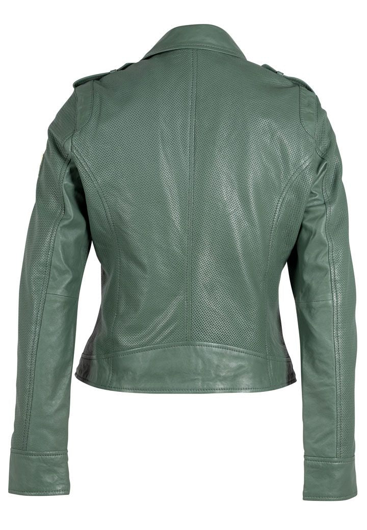 The Sinta leather jacket offers a subtle yet sophisticated style with its perforated design. Made with high-quality lambskin leather, this jacket provides excellent breathability and comfort. Elevate your wardrobe and stay cool in style.